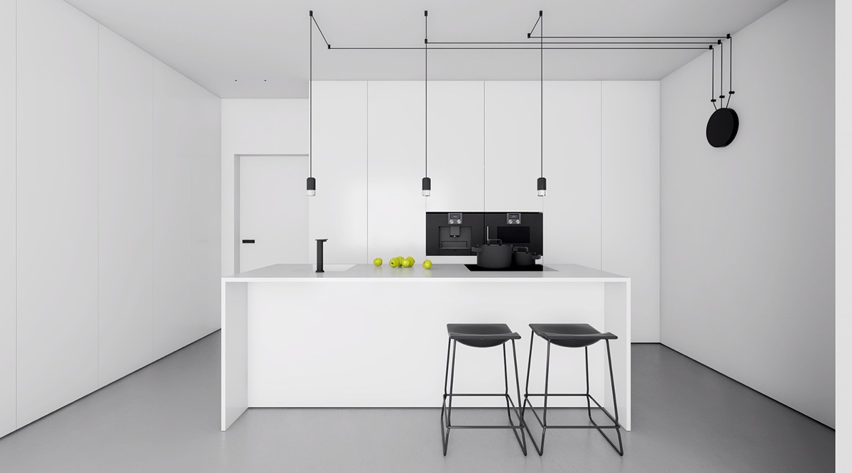 7. Nhìn tưởng chừng đơn giản mà không hề đơn giản với hình khối bàn bar, khu bếp ăn trong căn phòng này. Chỉ độc nhất một màu nhưng căn bếp có được nét đẹp sang trọng, tổng thể hài hòa