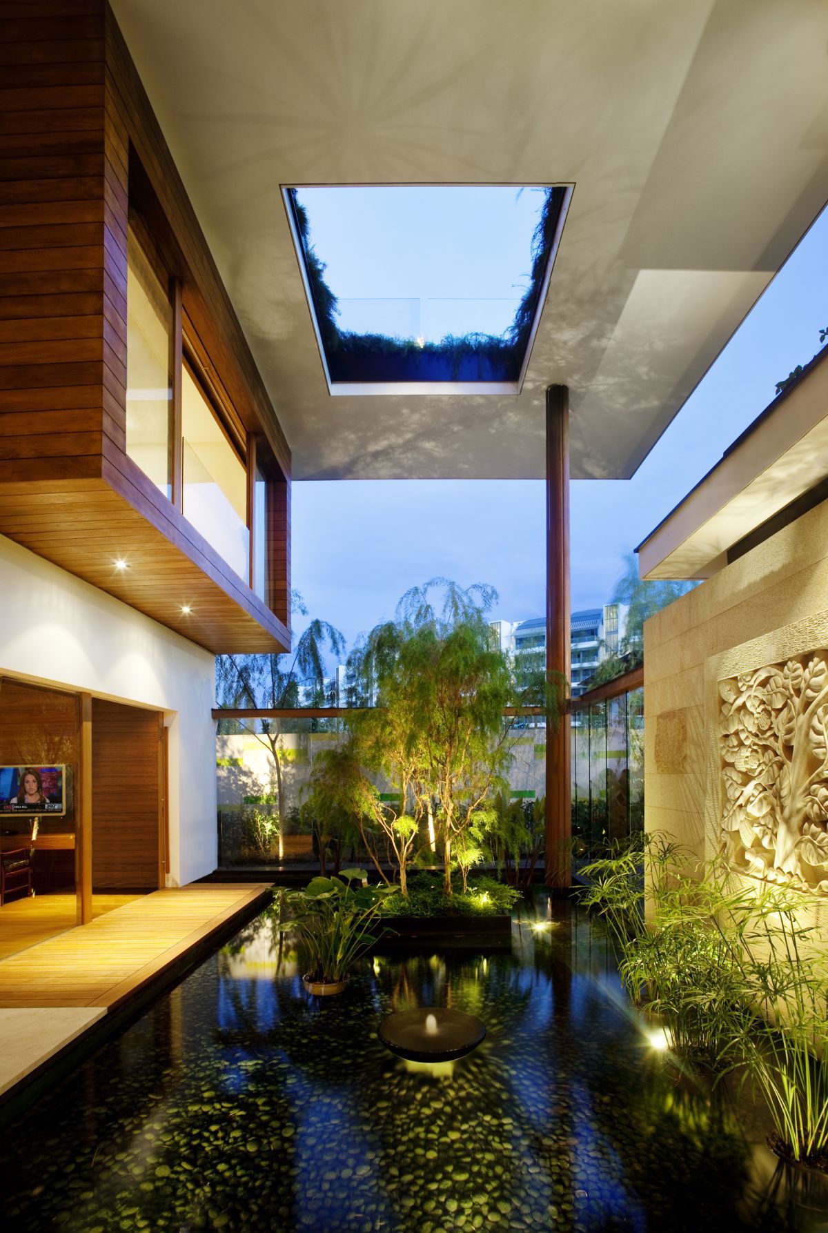 Bên trong ngôi nhà còn được thiết kế thêm tiểu cảnh, phía trước phòng khách. Tiểu cảnh có đủ hòn non bộ, nước và cây xanh. Phía trên trần được thiết kế kính thu ánh sáng từ bên ngoài vào, tạo không gian sáng tự nhiên.