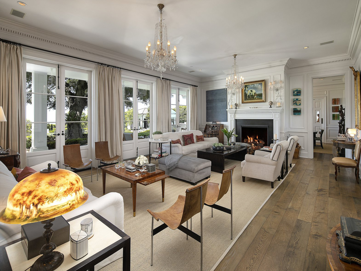 Bộ sofa dài màu trắng cùng dàn đèn chùm pha lê tinh tế cộng thêm điểm nhấn đắt giá là chiếc bàn đá đen tuyền nổi bật giữa một căn phòng khách rộng lớn. Thêm một bộ bàn trà màu gỗ được xếp dọc căn phòng, hòa hợp với bối cảnh tạo nên sự ấm áp cho căn phòng khách này.