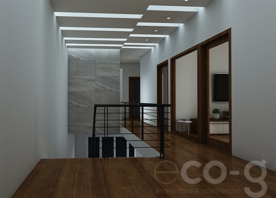 Hành lang luôn luôn được phủ bởi ánh sáng tự nhiên, là bởi hệ thống của sổ bằng kính sáng, hệ thống trần rỗng được xếp theo lan. Cầu thang được thiết kế hài hòa sáng tạo với hình thức ghim tường, vật liệu bằng gỗ tone sur tone với bản lề của chính, cửa sổ là 1 điểm nhấn đẹp cho căn biệt thự hiện đại này