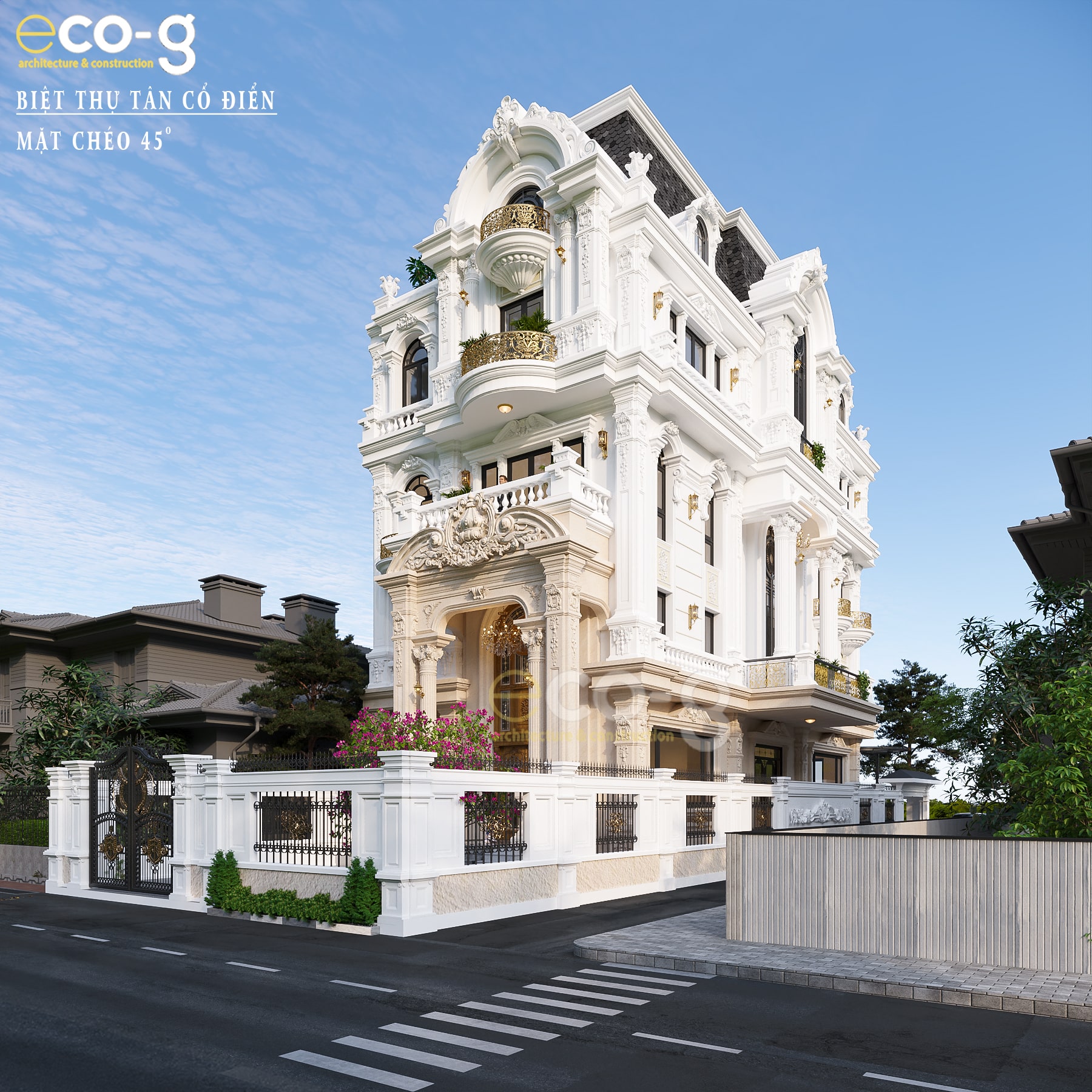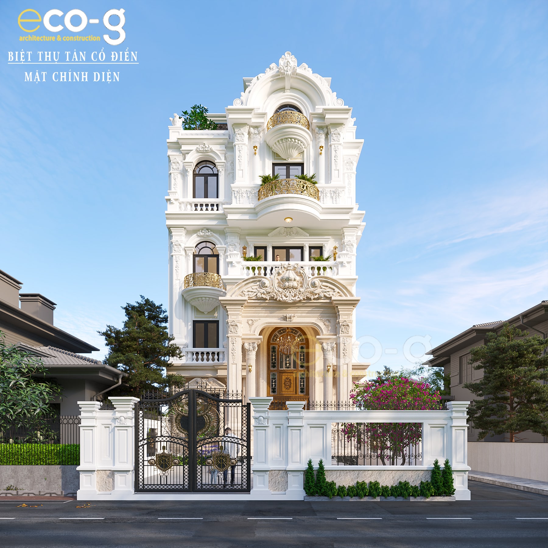Thiết kế mang phong cách tân cổ điển thể hiện rõ vẻ đẹp quyền quý, sang trọng và đậm chất nghệ thuật. Thiết kế được bố trí đối xứng, tạo cảm giác cân bằng và bề thế – một nguyên tắc đặc trưng trong kiến trúc tân cổ điển. Toàn bộ mặt đứng sử dụng gam màu trắng kem thanh nhã làm chủ đạo, phối hợp cùng các chi tiết mạ vàng ở lan can, cửa và cổng để tạo điểm nhấn quý phái.