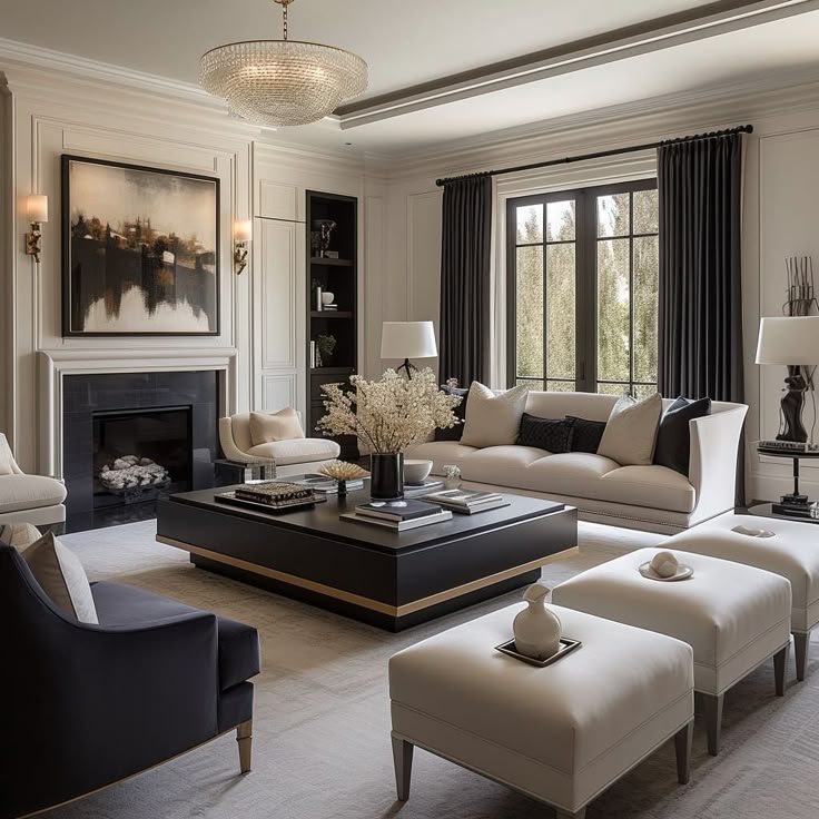 Phòng khách tân cổ điển thường được bố trí theo nguyên tắc đối xứng – đây là đặc trưng nổi bật của phong cách này. Ghế sofa, bàn trà, đèn, tranh trang trí hay kệ tủ thường được sắp đặt đối xứng quanh một trục trung tâm (thường là bàn hoặc lò sưởi). Điều này tạo cảm giác ổn định, chỉn chu và sang trọng.