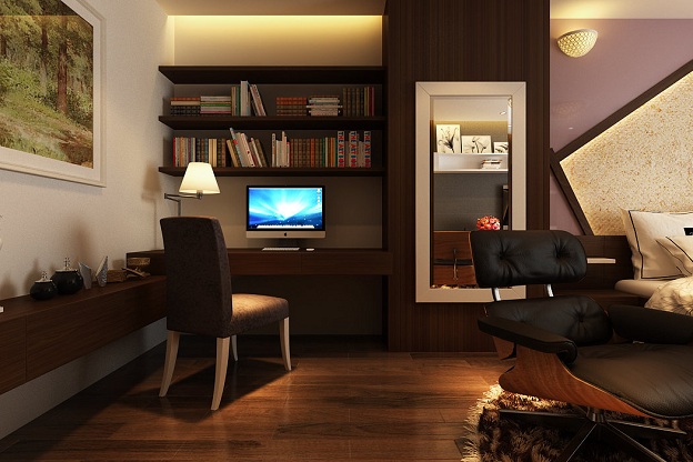 Khu vực học tập được thiết kế với những tấm ván mỏng, giá treo chia thành nhiều nấc cài để chủ nhân dễ dàng bố trí kệ theo chiều cao phù hợp. Bố trí khu học tập đối diện với cửa sổ, cạnh cửa ra vào cùng với hệ thốgn giá sách tuy nhỏ nhưng độc đáo. Bàn làm việc khá tiện lợi