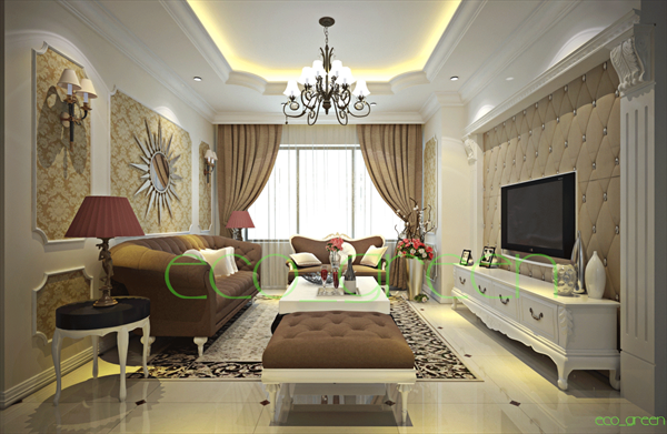 Phòng khách của căn hộ được sử dụng tông màu trắng làm chủ đạo, và màu vàng cát cho các chi tiết quan trọng khác để làm tôn lên sự sang trọng và tính thẩm mỹ cho căn hộ. Bộ ghế sô pha màu nâu đồng đặt cạnh sửa sổ cùng với chiếc bàn vuông trắng chân gỗ sơn đen làm tăng thêm ấn tượng cho căn phòng. Điểm nhấn của căn phòng là các bức tường được thiết kế như những bức tranh hoa văn nghệ thuật châu Âu đặc sắc. Đèn chùm được thiết kế lạ mắt như 1 bông hoa treo giữa căn phòng, các đường nét thanh kim loại uốn lượn tài tình làm cho căn phòng trông sang trọng và bắt mắt hơn.