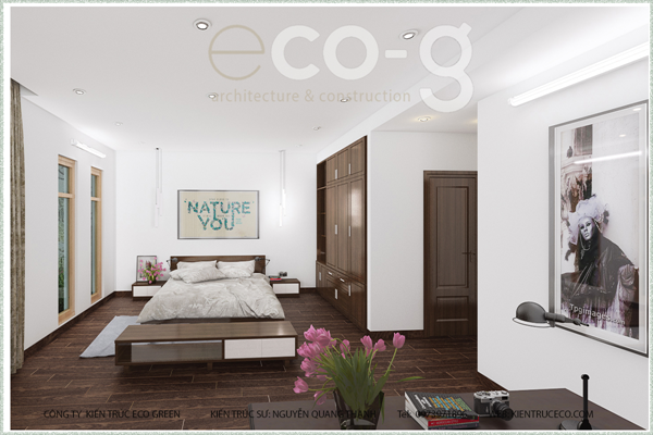 Với tiêu chí thiết kế làm sao để căn phòng trông thoáng mát, đồ đạc sắp xếp hợp lý trông rối mắt và cũng không được để căn phòng trống trải đơn sơ. Các kts Eco đã bàn luận và đưa ra mẫu phòng ngủ đúng như yêu cầu của Anh Cường này. căn phòng được lát sàn gỗ nâu óc chó, đây cũng là màu của bệ đỡ giường nằm và tủ quần áo, việc các đồ quan trọng cùng màu nâu làm căn phòng trông thanh nhã nhẹ nhàng hơn. Nếu màu sắc quá lòe loẹt sẽ khiến cảm giác mệt mỏi và gây khó ngủ hơn.
