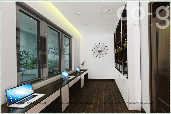 Phòng làm việc là 1 căn phòng đặc biệt của căn nhà này. Căn phòng rộng rãi với chiếc tủ đứng kịch tường và chiếc bàn trải dài cả căn phòng , nơi các thành viên trong gia đình có khu vực riêng tư để đọc sách, làm việc. Thiết kế của căn phòng này giống như 1 thư viện tại gia với tủ đựng sách đủ rộng để có thể chứa rất nhiều cuốn sách yêu thích. Căn phòng được thiết kế ở 1 góc riêng tư của căn nhà nhưng có view nhìn ra bên ngoài khuôn viên trồng cây xanh.